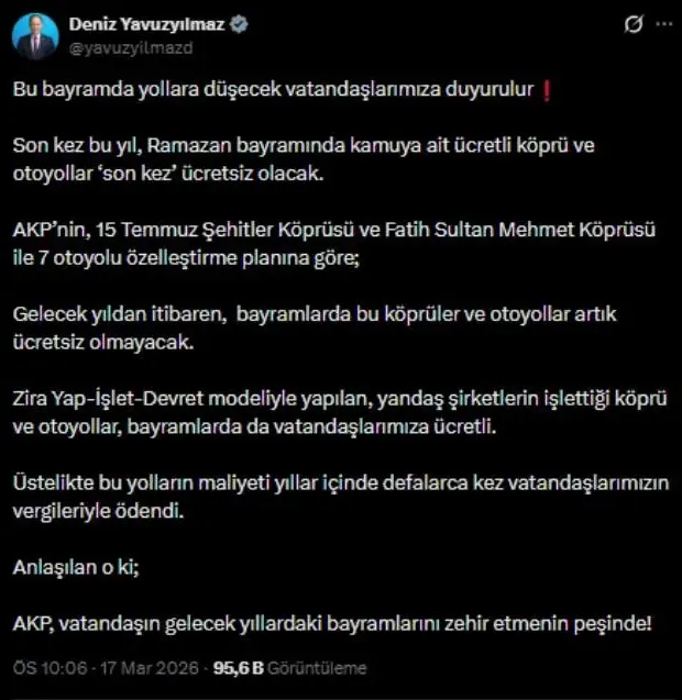 Deniz Yavuzyılmaz, kamuya ait köprü ve otoyollarla ilgili uzun süredir tartışılan özelleştirme iddialarını bir kez daha gündeme taşıdı. Yavuzyılmaz, sosyal medya hesabından yaptığı açıklamada, bayramlarda uygulanan ücretsiz geçişlerin bu yıl “son kez” olabileceğini belirterek dikkat çeken bir uyarıda bulundu.