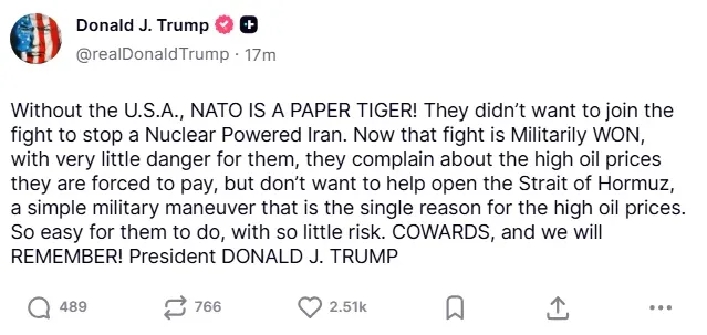 Trump, kendilerine yeterli askeri destek vermediğini düşündüğü ülkelere ise sert bir mesaj göndererek, “Korkaklar ve bunu hatırlayacağız” ifadelerini kullandı.