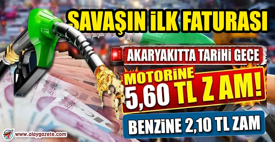 "Savaşın, ilk faturası... Akaryakıta tarihi zam. Sektör kaynakları, salıyı çarşambaya bağlayan gece yarısı motorine 5 TL 60 kuruş, benzine 2 TL 10 kuruş zam beklendiğini söyledi. Net tutarlar sabah belli olacak. Bu zamla birlikte motorinin litresi Ankara'da 67 TL'yi görecek."