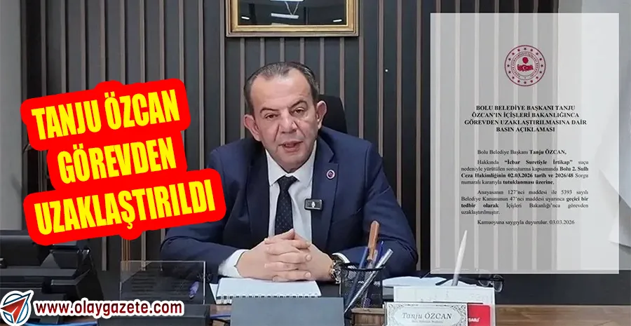 "Bolu Belediye Başkanı Tanju Özcan, hakkında 'İcbar suretiyle irtikap' suçu nedeniyle yürütülen soruşturma kapsamında Bolu 2. Sulh Ceza Hakimliğinin 02.03.2026 tarih ve 2026/48 Sorgu numaralı kararıyla tutuklanması üzerine, Anayasanın 127'nci maddesi ile 5393 sayılı Belediye Kanunu'nun 47'nci maddesi uyarınca geçici bir tedbir olarak uzaklaştırılmıştır."