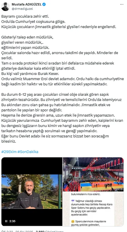 CHP Ordu Milletvekili Mustafa Adıgüzel, Ordu’da 29 Ekim Cumhuriyet Bayramı kutlamaları sırasında 6-12 yaş arasındaki çocuklar tarafından yapılması planlanan jimnastik gösterisinin Ordu Vali Yardımcısı Burak Keser tarafından çocukların bacaklarının görünmesi gerekçesiyle iptal ettirildiğini duyurdu. Adıgüzel, "Bu adam hakkında derhal gereği yapılmalıdır" dedi.