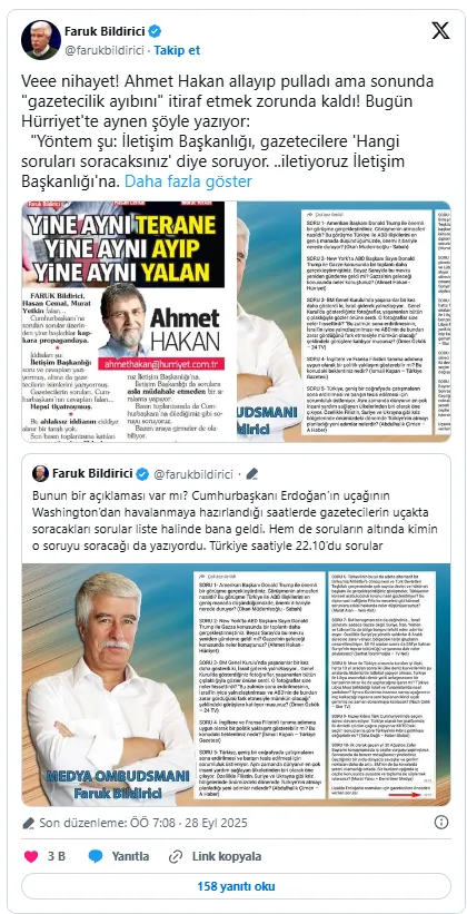 Faruk Bildirici Ahmet Hakan'ın itiraf niteliğindeki yazısına ilişkin yaptığı paylaşımında, "Veee nihayet! Ahmet Hakan allayıp pulladı ama sonunda "gazetecilik ayıbını" itiraf etmek zorunda kaldı!" dedi.