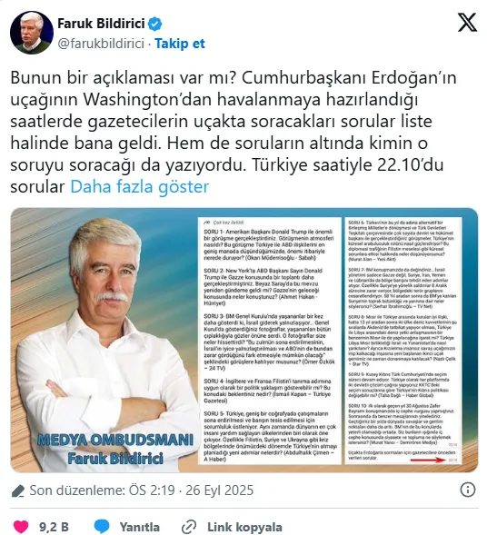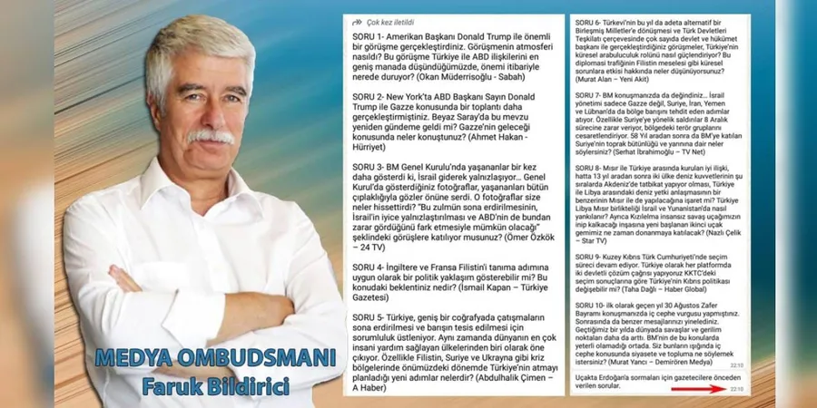 Erdoğan'ın ABD ziyaretinin ardından uçakta basın mensuplarının sorularını yanıtlamasının ardından Medya Ombudsmanı Faruk Bildirici skandalı açıkladı. Bildirici, Erdoğan'a yöneltilen soruların kendisine saatler öncesinden ulaştığını açıklamış, sıralamasının bile aynı olduğunu aktarmıştı.