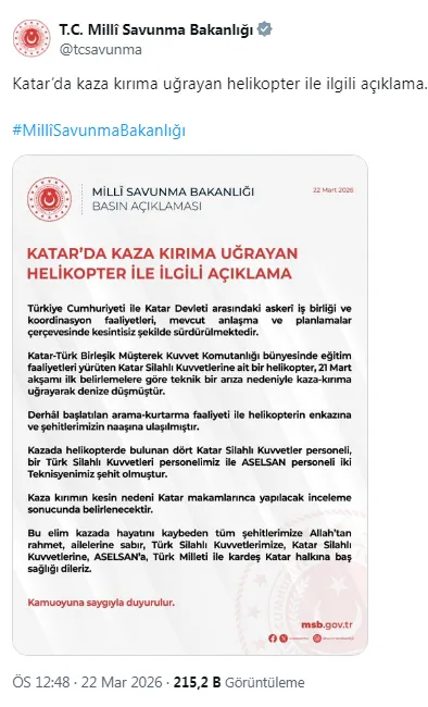 Açıklamada, Türkiye ile Katar arasındaki askeri iş birliği faaliyetlerinin mevcut anlaşmalar çerçevesinde sürdüğü vurgulanırken, kazanın kesin nedeninin Katar makamlarının yapacağı teknik inceleme sonucunda netleşeceği ifade edildi.