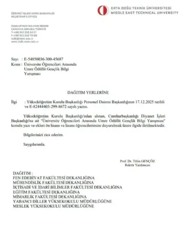 Rektörlük tarafından gönderilen resmi yazıda, duyurunun dayanağı olarak YÖK Personel Dairesi Başkanlığı’nın 17 Aralık 2025 tarihli yazısı gösterildi. Yazıda, söz konusu yarışmanın üniversitelerde öğrenim gören ön lisans ve lisans öğrencilerine duyurulmasının YÖK tarafından uygun bulunduğu belirtildi.