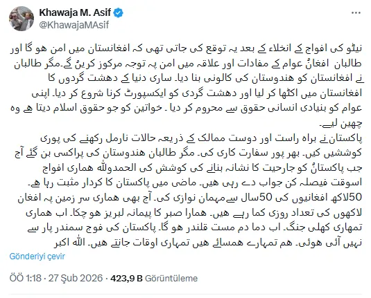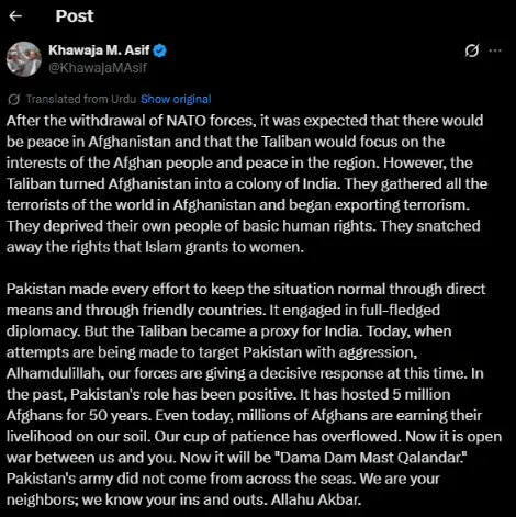 ''NATO güçlerinin çekilmesinin ardından Afganistan'da barışın sağlanacağı ve Taliban'ın Afgan halkının çıkarlarına ve bölgedeki barışa odaklanacağı bekleniyordu. Ancak Taliban, Afganistan'ı Hindistan'ın bir kolonisi haline getirdi. Dünyanın dört bir yanından teröristleri Afganistan'da topladılar ve terörizmi ihraç etmeye başladılar. Halklarını temel insan haklarından mahrum ettiler. İslam'ın kadınlara verdiği hakları ellerinden aldılar. Pakistan, durumu normal tutmak için doğrudan ve dost ülkeler aracılığıyla her türlü çabayı gösterdi. Kapsamlı diplomasi yürüttü. Ancak Taliban, Hindistan'ın vekili haline geldi. Bugün Pakistan saldırganlığı hedef almaya çalıştığında, Elhamdülillah, güçlerimiz kararlı bir karşılık veriyor. Pakistan'ın geçmişteki rolü olumluydu. 50 yıldır 5 milyon Afgan'a ev sahipliği yaptı. Bugün bile milyonlarca Afgan topraklarımızda geçimini sağlıyor. Sabrımız tükendi. Şimdi sizinle açık bir savaşa gireceğiz. Şimdi ateş kibrit olacak. Pakistan ordusu denizden gelmedi. Biz sizin komşularınızız, zamanınızı biliyoruz. Allahu Ekber.''