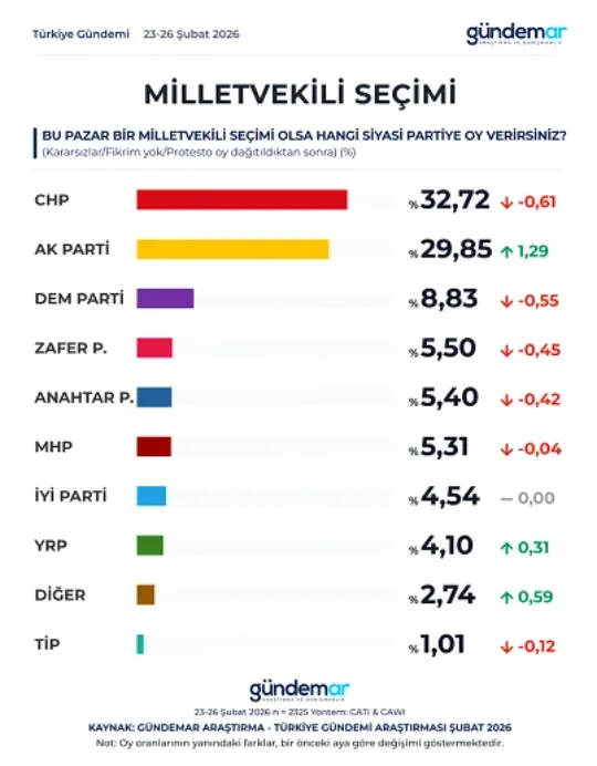 23–26 Şubat 2026 tarihleri arasında gerçekleştirilen araştırmaya göre Cumhurbaşkanı Recep Tayyip Erdoğan’ın karşısına farklı adayların çıkarıldığı üç senaryoda da seçim sonuçları Erdoğan’ın aleyhine şekilleniyor.