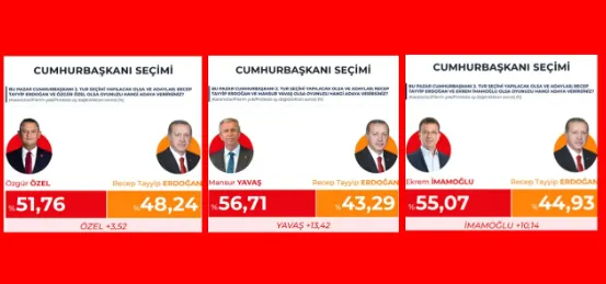 Araştırma sonuçları, olası bir seçim senaryosunda muhalefet adaylarının Cumhurbaşkanı Erdoğan karşısında önde göründüğüne işaret etti.