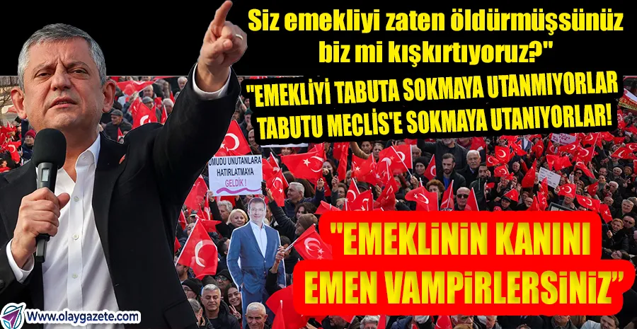 Meclis’te en düşük emekli maaşının 20 bin TL’ye çıkarılması sürecinde yaşananları hatırlatan Özgür Özel, muhalefetin asgari ücret seviyesindeki zam talebinin reddedilmesine ve Meclis kürsüsüne getirilen sembolik tabuta yapılan müdahaleye değindi. Özel, iktidara yönelik şu ağır suçlamada bulundu: "Emekliyi tabuta sokmaya utanmıyorlar, tabutu Meclis'e sokmaya utanıyorlar! O tabuta ve mezar taşına ancak vampirler saldırır. Siz emeklinin kanını emen vampirlersiniz! Şimdi de çıkmış 'CHP emekliyi bize kışkırtıyor' diyorlar. Siz emekliyi zaten öldürmüşsünüz, biz mi kışkırtıyoruz?"