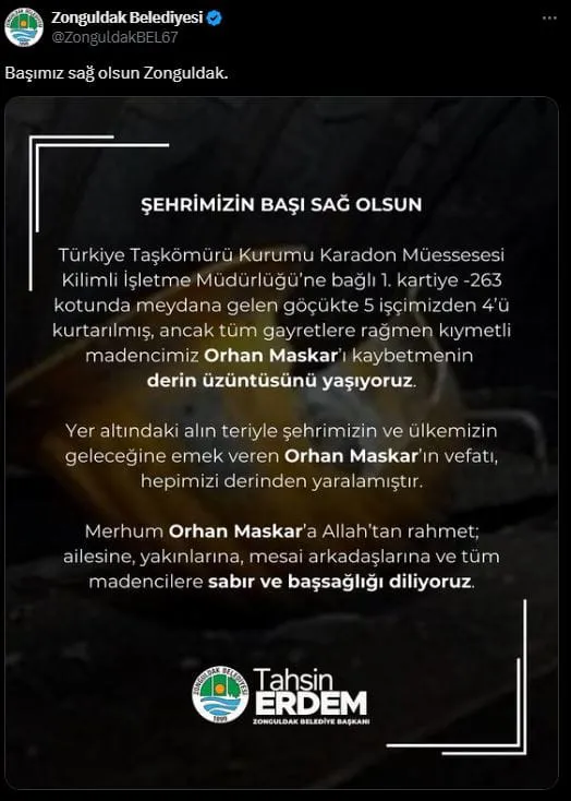 Zonguldak Belediyesi, hayatını kaybeden madenci Orhan Maskar'a ilişkin, "Türkiye Taşkömürü Kurumu Karadon Müessesesi Kilimli İşletme Müdürlüğü'ne bağlı 1. kartiye - 263 kotunda meydana gelen göçükte 5 işçimizden 4'ü kurtarılmış, ancak tüm gayretlere rağmen kıymetli madencimiz Orhan Maskar'ı kaybetmenin derin üzüntüsünü yaşıyoruz" açıklamasında bulundu.