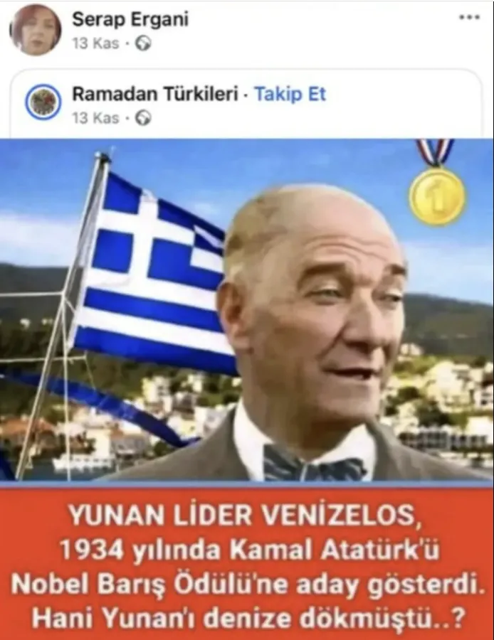 Söz konusu paylaşımda, “Yunan lider Venizelos, 1934 yılında Kemal Atatürk'ü Nobel Barış Ödülü'ne aday gösterdi. Hani Yunan'ı denize dökmüştü?” ifadeleri yer aldı.