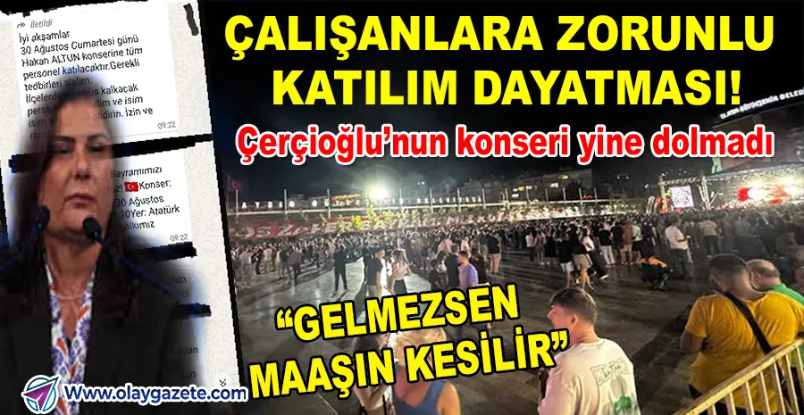 Aydın Büyükşehir Belediye Başkanı Özlem Çerçioğlu’nun geçen hafta yapılan belediye konserinde boş koltukların dikkat çekmesinin ardından bu kez farklı bir “önlem” aldığı ileri sürüldü. Konser öncesi belediye çalışanlarına gönderilen mesajlarda, etkinliğe katılımın zorunlu olduğu ve katılan-katılmayanların listelerinin çıkarılacağı belirtildi.