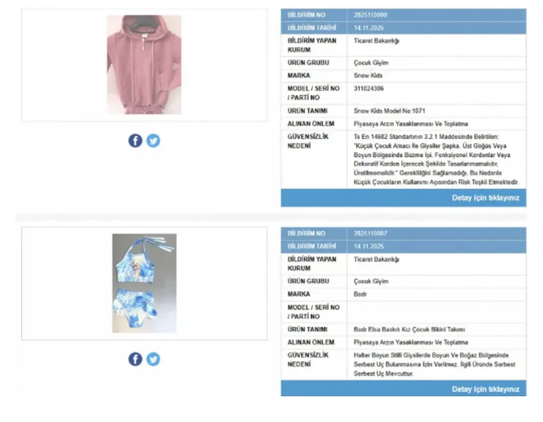Ticaret Bakanlığı, piyasa gözetimi ve denetimi faaliyetleri kapsamında yürüttüğü çalışmalar sonucunda, iki çocuk giyim ürününün sağlık açısından ciddi risk taşıdığını tespit etti. Snow Kids ve Badr markalarına ait ürünler için “piyasaya arzın yasaklanması ve toplatma” kararı alındı.
