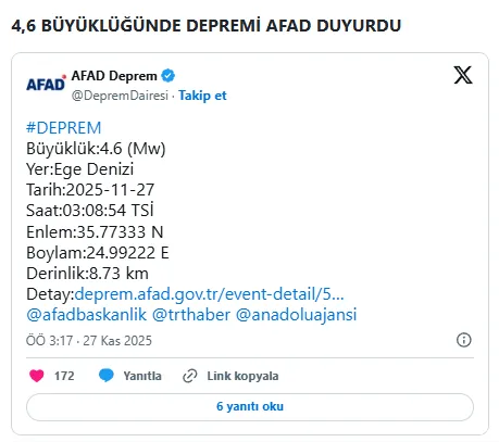Ege Denizi gece saatlerinde yeni bir sarsıntıyla gündeme geldi. Afet ve Acil Durum Yönetimi Başkanlığı (AFAD), saat 03.08’de Ege Denizi açıklarında 4,6 büyüklüğünde bir deprem meydana geldiğini duyurdu. Açıklamada, depremin 8,73 kilometre derinlikte kaydedildiği belirtildi.