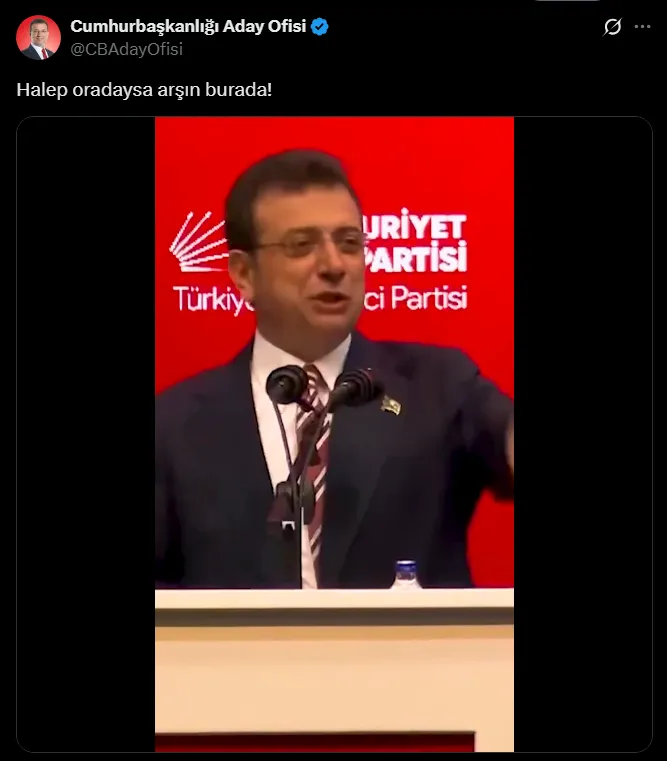 Şarkıyı sosyal medya hesabından paylaşan İmamoğlu, daha önce bir mitingde kullandığı "Halep oradaysa arşın burada" sözüne de paylaşımında yer verdi.
