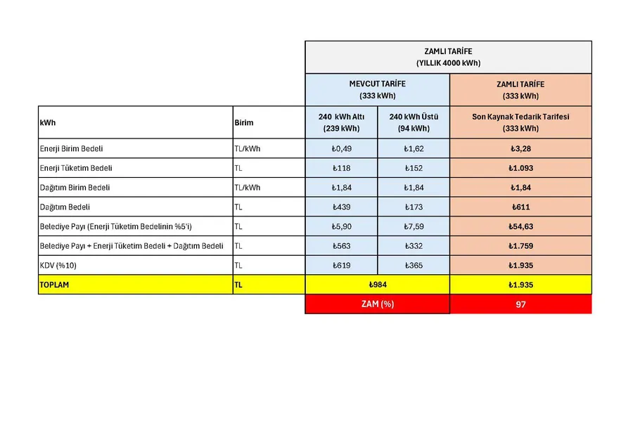 açıklamasında düzenleme ile elektrik faturalarına tarihi bir zam yapıldığını açıkladı.