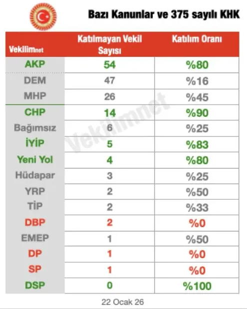 Oylamaya katılmayan milletvekillerinin parti dağılımı da dikkat çekici bir tablo ortaya koydu. Buna göre, 54 milletvekili ile AKP en fazla katılım göstermeyen parti olurken, onu 47 milletvekili ile DEM Parti, 26 milletvekili ile MHP ve 14 milletvekili ile CHP izledi. Saadet Partisi, Demokrat Parti ve DBP’den ise hiçbir milletvekilinin oylamaya katılmadığı ifade edildi.