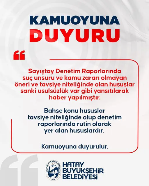 Hatay Büyükşehir Belediyesi, bazı haberlerde kullanılan dilin kamuoyunu yanıltıcı nitelik taşıdığına dikkat çekerek, bu yayınların kurumsal itibarı zedelemeye yönelik olduğunu belirtti. Açıklama, “Kamuoyuna duyurulur” ifadesiyle son buldu.