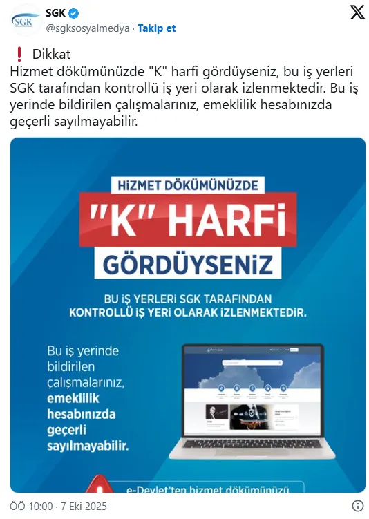 Sosyal Güvenlik Kurumu (SGK), hizmet dökümlerinde 'K' harfi görünenler hakkında uyarıda bulundu.SGK'de yapılan açıklamada, "Hizmet dökümünüzde 'K' harfi gördüyseniz, bu iş yerleri SGK tarafından kontrollü iş yeri olarak izlenmektedir" denildi.