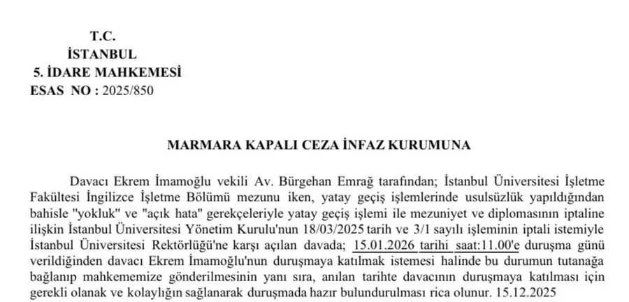 Sözcü’den Muratcan Altuntoprak’ın haberine göre, İstanbul İdare Mahkemesi, Ekrem İmamoğlu’nun duruşmaya katılımı nedeniyle İdare Mahkemesi İdari İşler Müdürlüğü’ne müzekkere yazarak duruşma için “uygun” bir salon hazırlanmasını talep etti. Bu adım, davanın olağan bir idari işlem dosyasının ötesinde, kamu düzeni ve güvenlik boyutlarıyla ele alındığını da ortaya koydu.