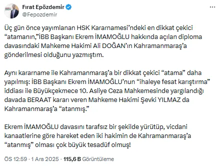 “Üç gün önce yayımlanan HSK Kararnamesi’ndeki en dikkat çekici ‘atamanın’ İBB Başkanı Ekrem İmamoğlu hakkında açılan diploma davasındaki Mahkeme Hakimi Ali Doğan’ın Kahramanmaraş’a gönderilmesi olduğunu yazmıştım. Aynı kararname ile Kahramanmaraş’a bir dikkat çekici “atama” daha yapılmış: İBB Başkanı Ekrem İmamoğlu’nun “ihaleye fesat karıştırma” iddiası ile Büyükçekmece 10. Asliye Ceza Mahkemesinde yargılandığı davada beraat kararı veren Mahkeme Hakimi Şevki Yılmaz da Kahramanmaraş’a ‘atanmış.’ Ekrem İmamoğlu davasını tarafsız bir şekilde yürütüp, vicdani kanaatlerine göre hareket eden iki hakimin de Kahramanmaraş’a ‘atanmış’ olması çok büyük tesadüf olmuş!"
