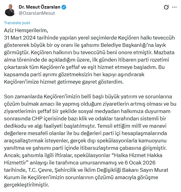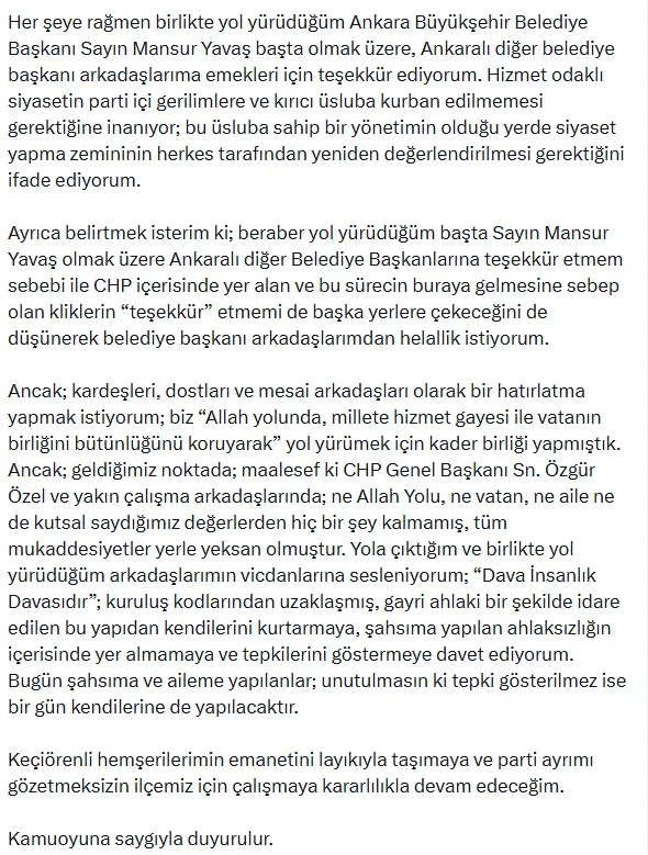 Özarslan açıklamasında ayrıca, Mansur Yavaş ve diğer belediye başkanlarına teşekkür etmesi nedeniyle parti içindeki bazı grupların bu durumu farklı yorumlayabileceğini düşündüğünü belirtti. Belediye başkanı arkadaşlarından helallik isteyen Özarslan, Keçiören halkına hizmet etmeye parti ayrımı gözetmeksizin devam edeceğini kaydetti.