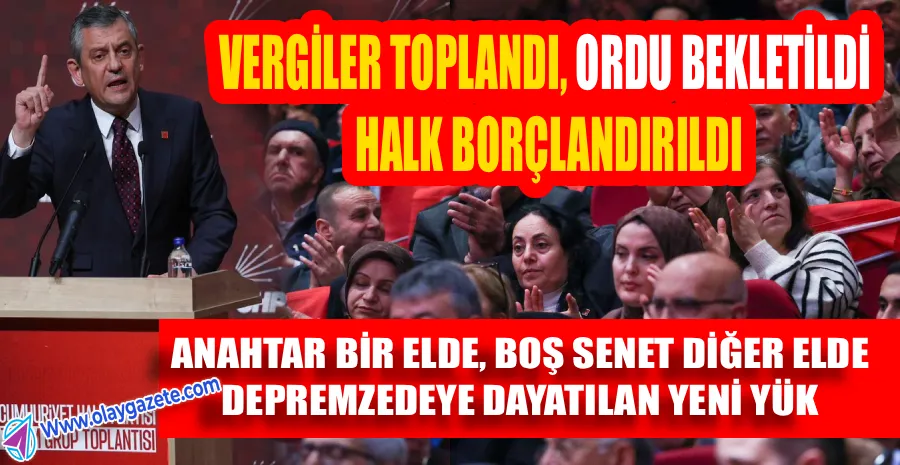 Deprem konutlarının teslimatındaki skandalı "açığa imza" olarak niteleyen Özel: "Devlet, depremzedeye 'evin bitti gel al' diyor. Elini uzatana 'dur' diyor; önüne boş senet koyuyor. 'Nokta nokta lira, nokta nokta faiz ödeyeceğim' diye imza istiyorlar. Genç bir avukat faiz kısmını çizmiş, 'Ya imzalarsın ya evi alamazsın' demişler. Bu sivil hayatta yapılsa Türk Ceza Kanunu'na göre tefeciliktir! Erdoğan'a çağrı yapıyorum; gel hiç olmazsa sabit ödeme olduğunu söyle, faiz ve TÜFE farkı alınmayacağını açıkla. Biz bedava olsun dedik, sen 'para verecekler hem de bana oy verecekler' dedin. Şimdi faiz de işletiyorsun!"