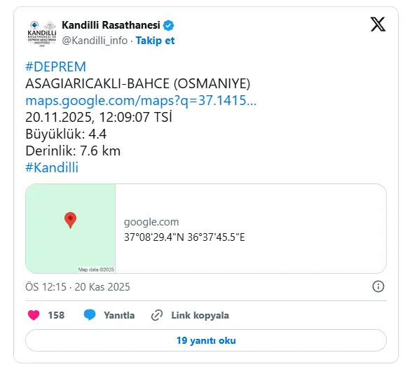 Boğaziçi Üniversitesi Kandilli Rasathanesi ve Deprem Araştırma Enstitüsü, bugün saat 12.09’da Osmaniye’nin Bahçe ilçesinde 4.4 büyüklüğünde bir deprem meydana geldiğini duyurdu. Açıklamaya göre sarsıntı 7.6 km derinlikte kaydedildi.
