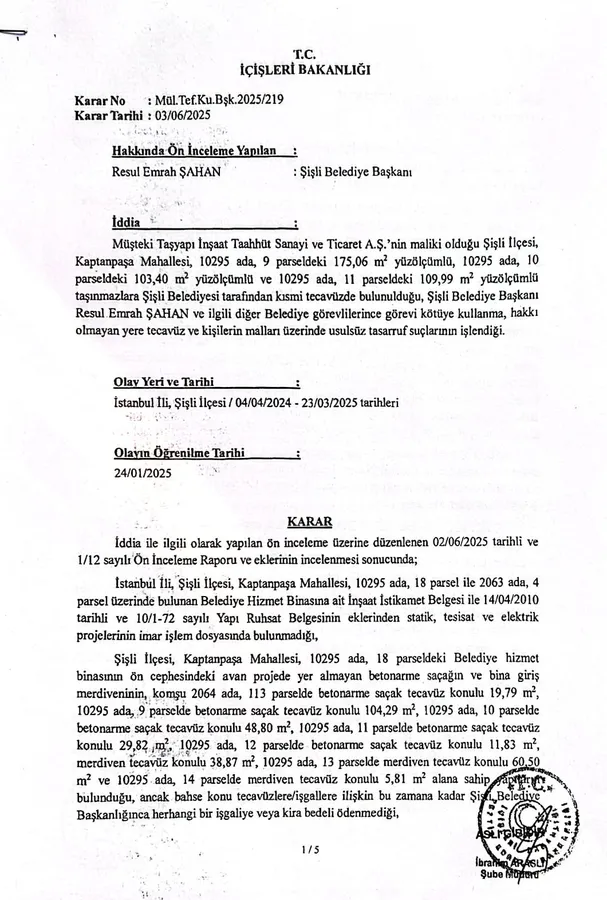 İçişleri Bakanlığı, 19 Mart operasyonlarında tutuklanan Şişli Belediye Başkanı Resul Emrah Şahan hakkında Taşyapı İnşaat tarafından yapılan şikâyet üzerine yürüttüğü incelemede, “hakkı olmayan yere tecavüz” ve “kişilerin malları üzerinde usulsüz tasarrufta bulunma” suçlamalarıyla soruşturma izni verdi. Aynı dosyada adı geçen ve Şahan’ın tutuklanmasının ardından İçişleri tarafından Şişli Belediyesi’ne kayyum olarak atanan Cevdet Ertürkmen’e soruşturma izni verilmemesi ise kararı ülke gündeminin merkezine taşıdı.