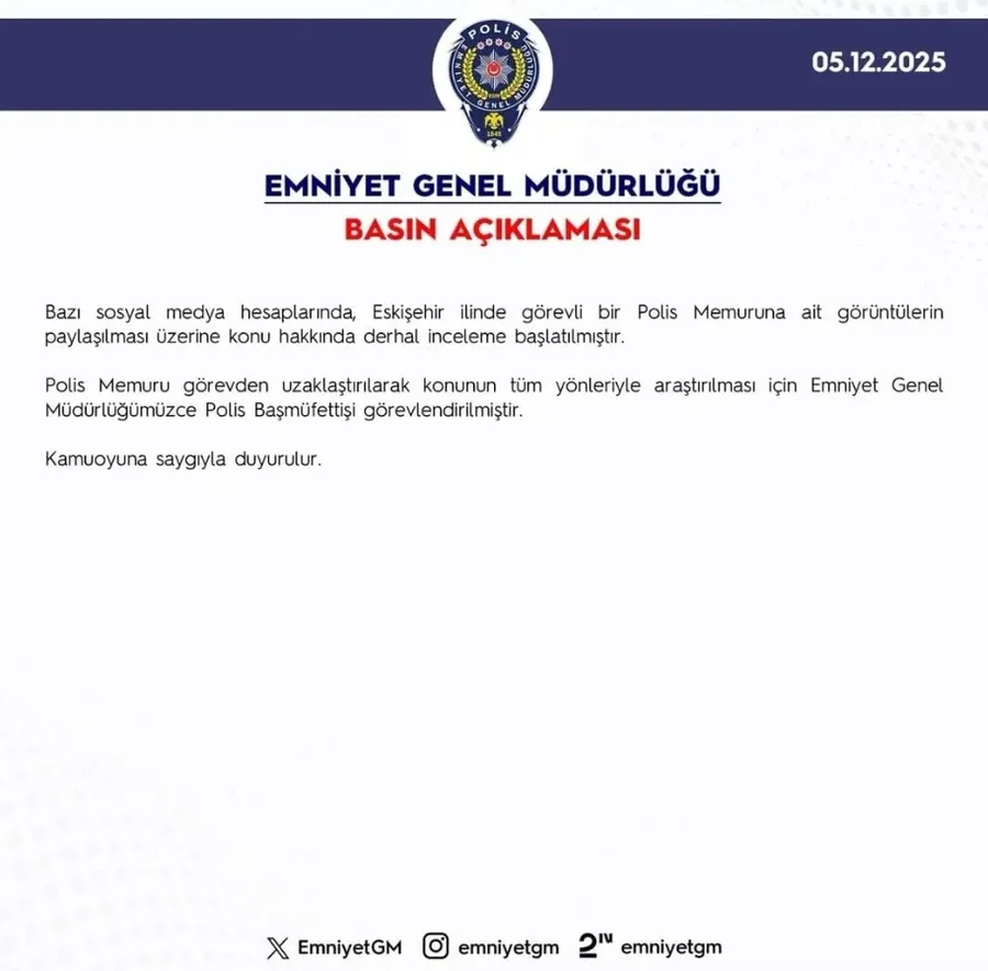 "Bazı sosyal medya hesaplarında, Eskişehir ilinde görevli bir Polis Memuruna ait görüntülerin paylaşılması üzerine konu hakkında derhal inceleme başlatılmıştır.